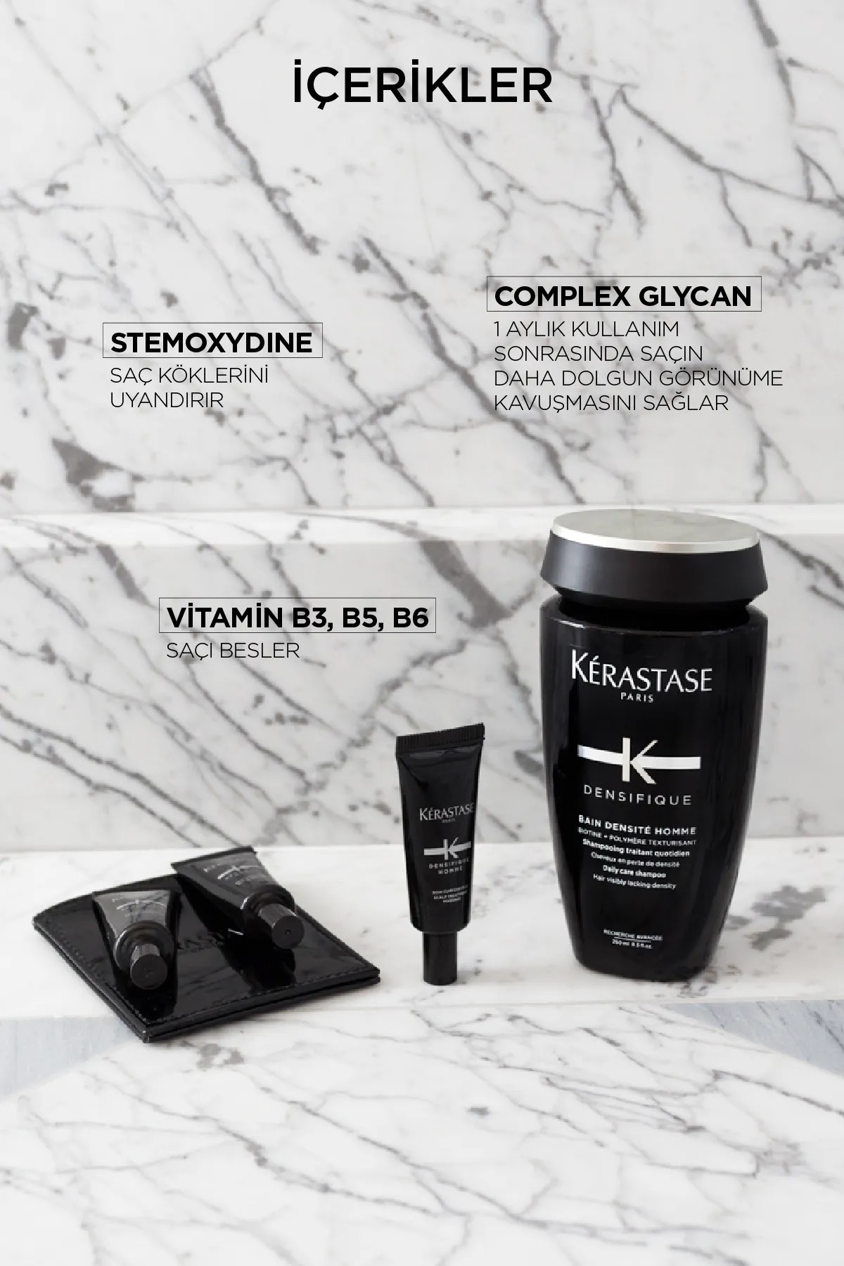 Bain Densité Homme, erkekler için gürlüğünü kaybetmiş saçlara özel günlük şampuandır.; Saçların daha gür ve dolgun görünmesini sağlayan kısa saçlara uygun son derece güçlü bir bakım sağlar.; Saç köklerini uyarıcı etkisi sayesinden saç dökülmesine engel olurken saçın hacmini de artıırarak saçlarının çoğalmasına ve kalınlaşmasını sağlar.; Dökülen saçlarınızın köklerinden onarım sağlayarak saç hacminizi yükseltir.; Ana İçerikler Biotin: Saç kökleri çevresinin kalitesini arttırır.; Taurine: Sağlıklı ve canlı saçlar için saç ve saç derisini koruyan aminoasit Kullanım Önerisi: Islak saça uygulayın, köpürtün, masaj yapın ve durulayın.; Boy:250ml Kullanma Amacı:Güçlendirici Cilt Tipi:İnce Telli/Zayıf Cinsiyet:UNISEX Yaş Grubu:UNISEX