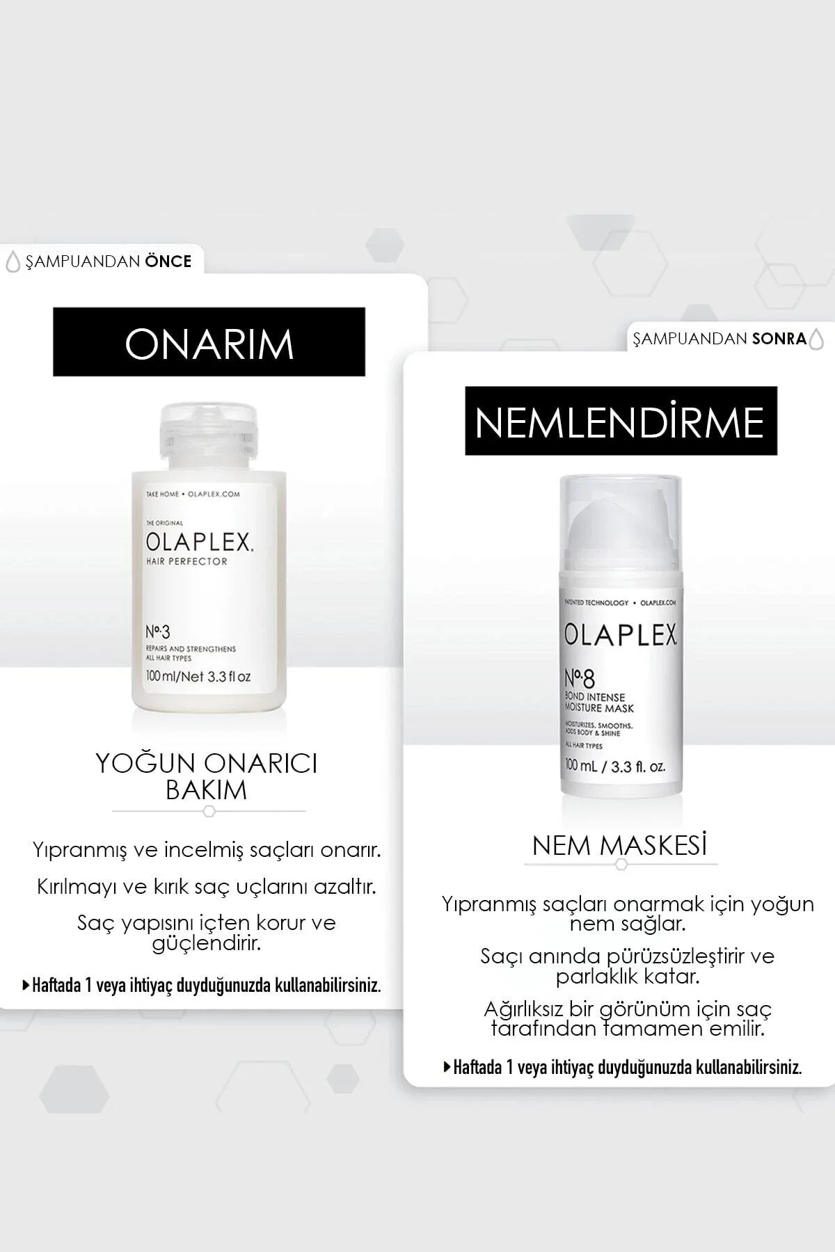 ;Ürün Özellikleri; ;Kuru ve hasarlı saçları tekrar hayata döndürmenin ilk adımını sunan yoğun onarıcı saç bakım spreyidir. ;İki aşamalı saç bakımının ilk adımında yer alan N° 0 Intensive Bond Building Hair Treatment, N°.3 Hair Perfector için astar görevi görür ve saç bağlarını yeniden kuvvetlendirmek için saç bakım tedavisinin etkinliğini arttırır. ;Olaplex’in patentli bağ oluşturma teknolojisinin en yüksek konsantrasyonuna sahiptir. ;Çok hasar görmüş, yıpranmış saçları onarır, güçlendirir ve sağlıklı görünmesini sağlar. ;Silikon içermeyen formülüyle çok hızlı sonuç verir. ;Tüm saç tipleri için uygundur. ;Kullanım Şekli; ;Kuru saç uygulayın ve ürünü eşit dağıtmak için saçınızı tarayın. ;10 dakika bekleyin ve durulamayın. Üzerine N°.3’ü uygulayıp bekletin. ;En az 20 dakika daha saçınızda bekletin. Daha uzun süre bekletmeniz bakımın daha iyi sonuçlar vermesine yardımcı olur. ;Ardından durulayıp şampuanlayın. ;En iyi sonuçlar için N°4 Şampuan ve N° 5 Saç Kremi kullanın.